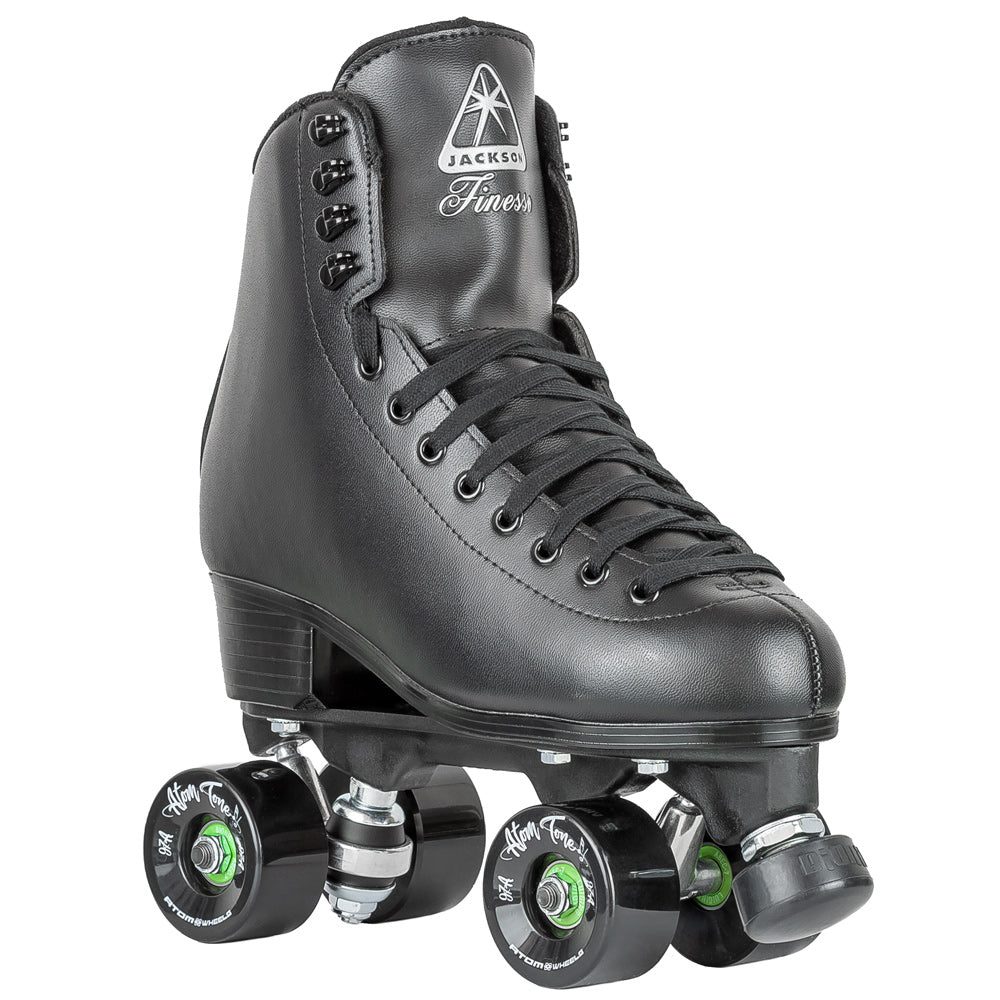 - Features: Boot: Jackson Finesse (Men's) Plate: Viper Zytel Nylon Bearings: Bionic ABEC 7 Wheels: Atom Tone 57x32mm 97a (Black) Sizes: Men's: 6-12 full sizes only Jackson Finesse Boot Features: Reinforced Vinyl coated uppers Anti-bacterial Nylex lining Solein board reinforcement for strength, feel, comfort and security Memory foam ankle padding for comfort and feel Flex notch for greater ankle flex A rolled collar that eliminates irritation to Achilles' tendons Foam-backed vinyl and mesh comfort tongue Stylized traditional PVC soles Vegan friendly Please refer to the size chart or contact our team for help as these skates are in US men's sizing.
