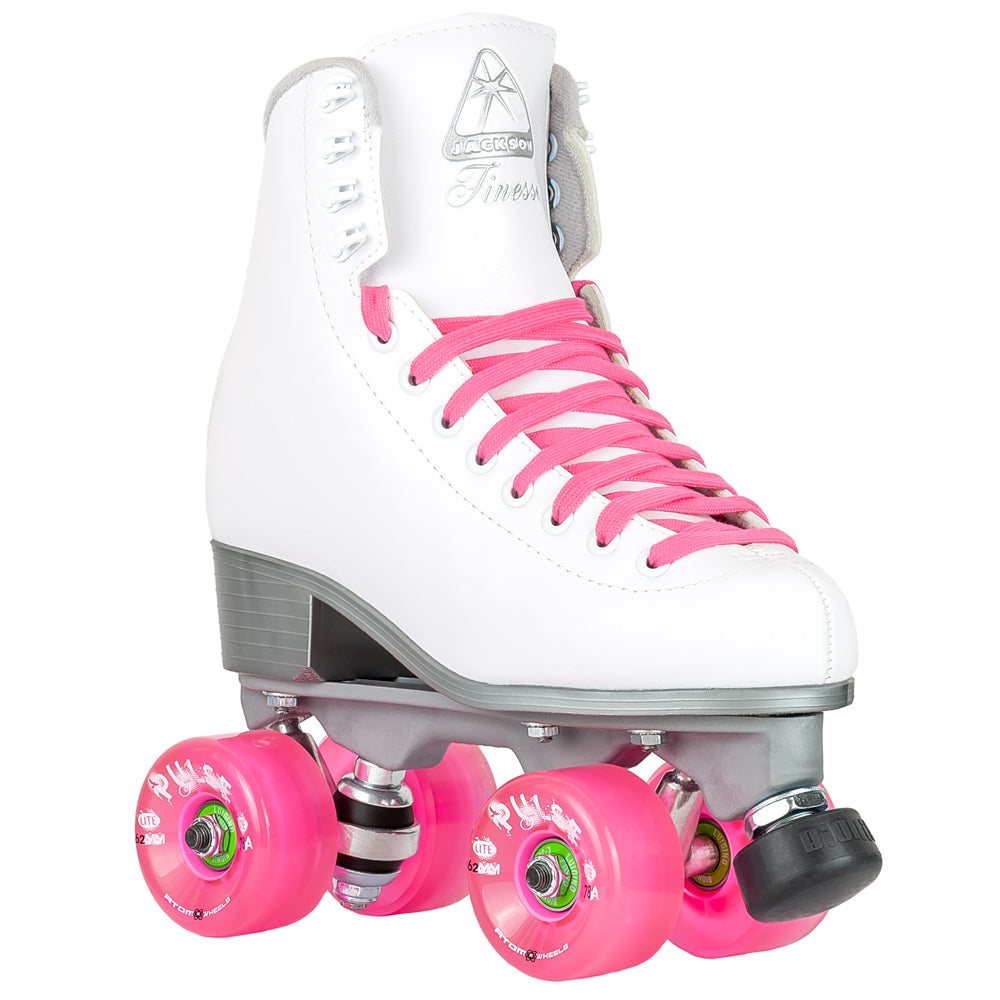 - Features: Boot: Jackson Finesse (Women's) Plate: Viper Zytel Nylon Bearings: Bionic ABEC 7 Wheels: Atom Pulse Lite 62x33mm 78a (Pink) Sizes: Men's: 4-9 full sizes only Jackson Finesse Boot Features: Reinforced Vinyl coated uppers Anti-bacterial Nylex lining Solein board reinforcement for strength, feel, comfort and security Memory foam ankle padding for comfort and feel Flex notch for greater ankle flex A rolled collar that eliminates irritation to Achilles' tendons Foam-backed vinyl and mesh comfort tongue Stylized traditional PVC soles Vegan friendly Please refer to the size chart or contact a team member for help as these skates are in US women's sizing.