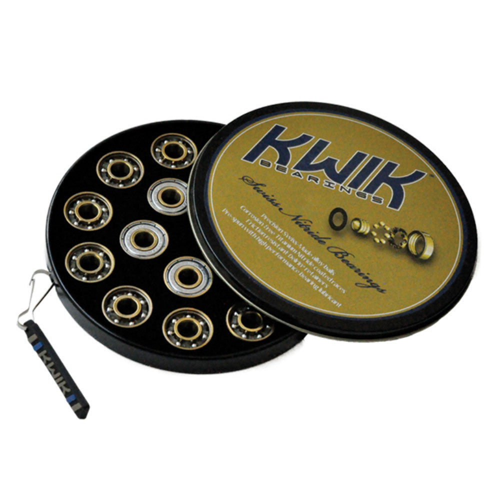 Kwik Swiss Nitride bearings contain Swiss-Made hardened chromium steel alloy balls. The races of the bearings are coated with a layer of Titanium Nitride to produce a fast and long roll.